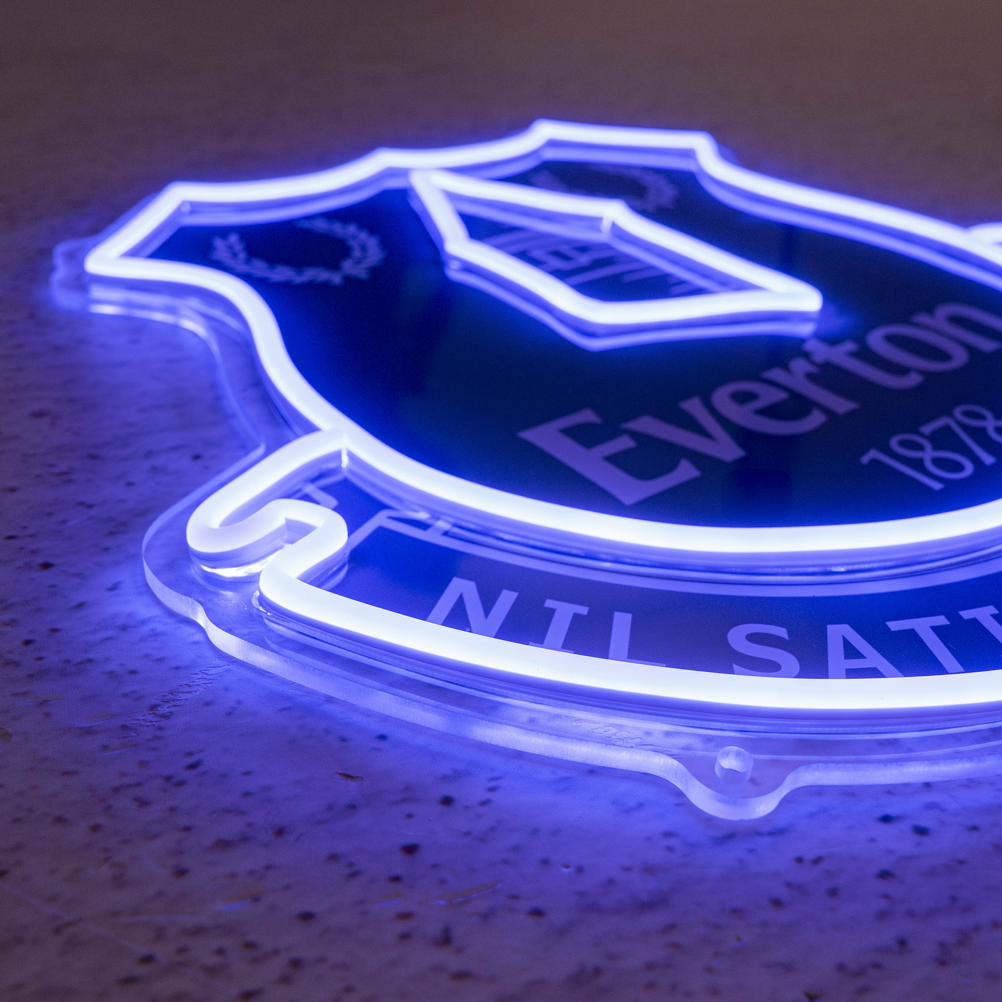 Light up your room with pride using this Everton FC LED Wall Light! Crafted with high-quality acrylic and bright LED lighting, this wall-mounted sign perfectly showcases the club’s iconic crest in striking blue. It’s the ideal decoration for any fan’s bedroom, living space, game room, or office.